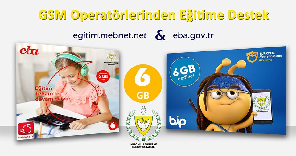 Bakanlıktan yapılan açıklamada Telsim ve KKTCELL Milli Eğitim ve Kültür Bakanlığına bağlı Kesintisiz Eğitim Merkezi portalı egitim.mebnet.net ile TC Milli Eğitim Bakanlığına ait eba.gov.tr eğitim portalına erişmek için kullanılabilecekleri 6 GB interneti 3 Nisan Cuma gününden itibaren her ay abonelerine ücretsiz şekilde tanımlayacak.