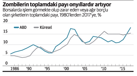 BIS de eylülde yayımladığı “Zombi Şirketler: Anatomisi ve Yaşam Döngüsü” başlıklı raporunda, 1980’li yıllarda toplamdaki payı %4 olan zombi şirketlerin oranının 2017 yılına gelindiğinde %15’e yükseldiğini vurguluyor.