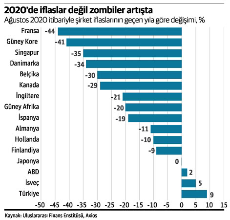 IIF verilerine göre dünya genelinde iflaslar bu yıl geçen yıla göre düşüş kaydetti. Axios’un IIF verilerinden derlediği 9 Ekim tarihli analizinde, COVID-19 önlemlerinin iflasları nasıl teknik olarak engellediğine ve bir iflas krizini ötelediğine dikkat çekiliyor. Verilere göre özellikle Fransa, Güney Kore, Singapur, Danimarka ve Belçika’da önlemler bu yıl Ağustos 2020 itibariyle gerçekleşen iflas sayısını %30 ila 44 azalttı.