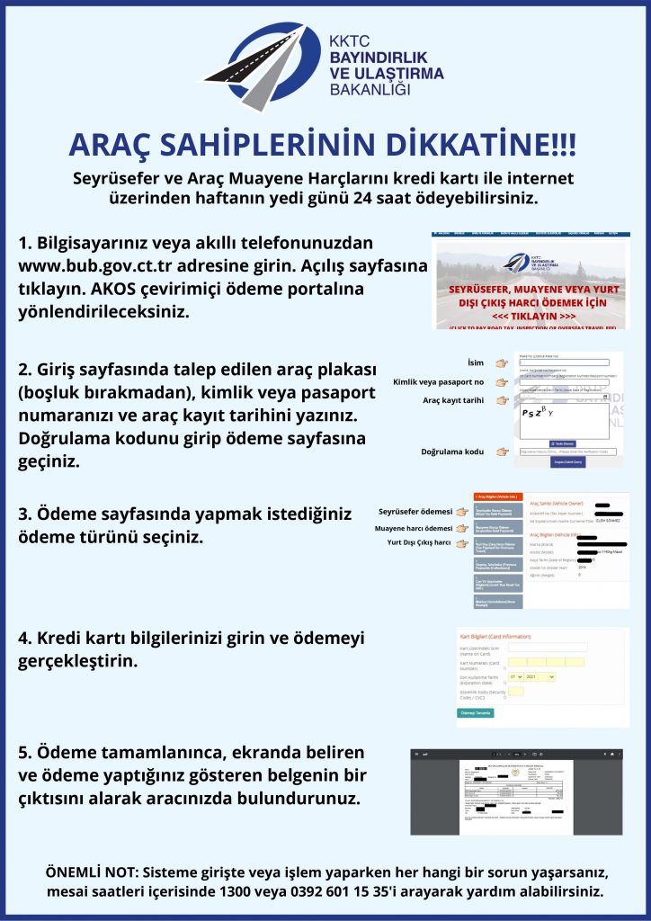 Açıklamada, araç sahiplerinin internet üzerinden seyrüsefer veya muayene harcı ödemek isterken herhangi bir sorun ile karşılaşmaları halinde, mesai saatleri içerisinde 1300 veya 0392 601 15 35’i arayarak yardım alabilecekleri belirtildi.