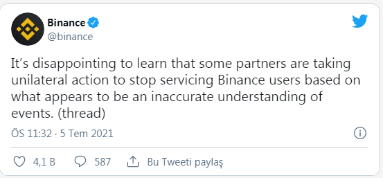 Binance‘in Twitter hesabından yapılan açıklamada şu ifadelere yer verildi:
