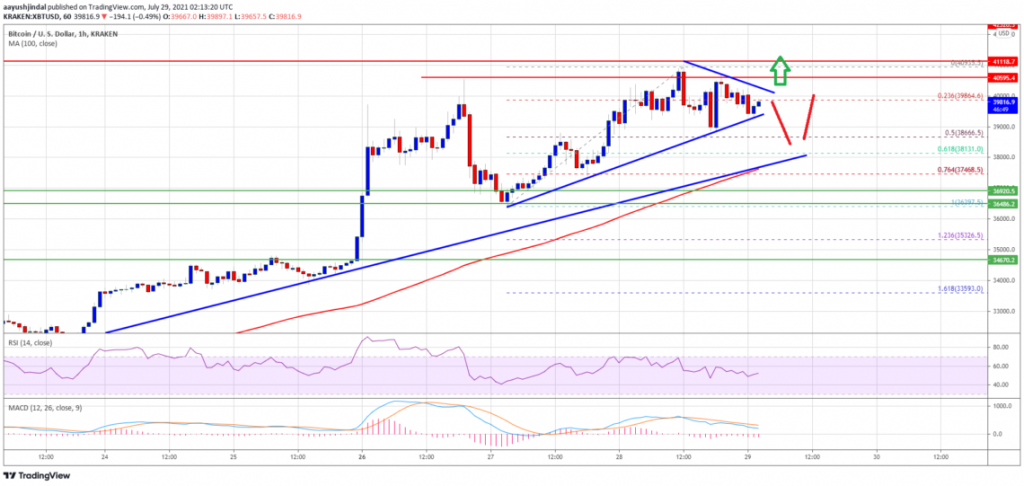 Bitcoin fiyatı, ABD Doları karşısında 39.000 dolar seviyesinin üzerinde pozitif bir bölgede kaldı. BTC’nin 40.500 dolar ve 41.000 doların üzerine çıkması muhtemel. NewsBTC’den Aayush Jindal’ın teknik analizine göre: