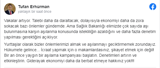 “Hükümete gelince… İcraat yapmak için o makamlardasınız, şikâyet etmek için değil! Bir an önce yaygın bir aşılama kampanyası başlatın. Denetimleri artırın ve etkinleştirin. Giderayak ekonomiyi daha da berbat etmeye hakkınız yok!”