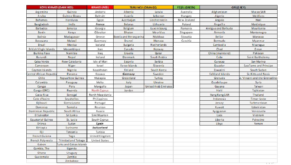• Ülkelerin renk kodları ile ilgili güncel tablo ve giriş kriterleri komitemiz tarafından yayınlanmasından sonraki ilk Pazartesi gününden itibaren uygulanacaktır.