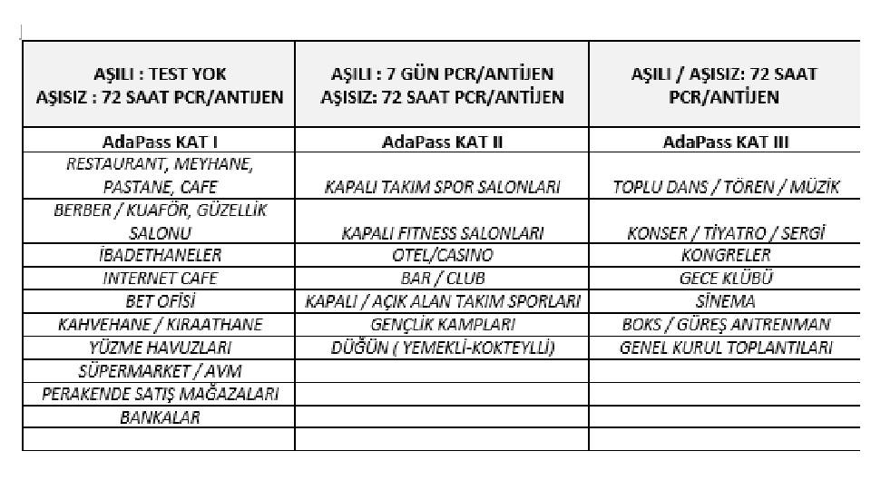 • MEKAN/SEKTÖR/AKTİVİTE/ETKİNLİKLERE GİRİŞ YAPACAK KİŞİLERİN ADAPASS SİSTEMİ ÜZERİNDEN KONTROL EDİLECEK AŞI VE PCR KRİTERLERİ AŞAĞIDAKİ TABLODA BELİRTİLMİŞTİR.