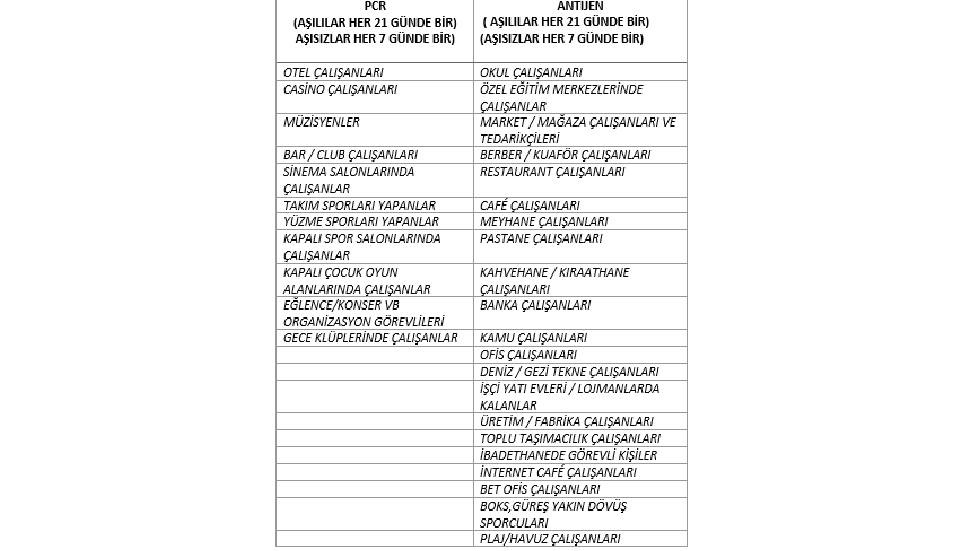Aşağıda tabloda PCR olarak belirtilen: sektör çalışanları aşılılar her 21 günde bir aşısızlar ise her 7 günde bir PCR testlerini yineleyeceklerdir.