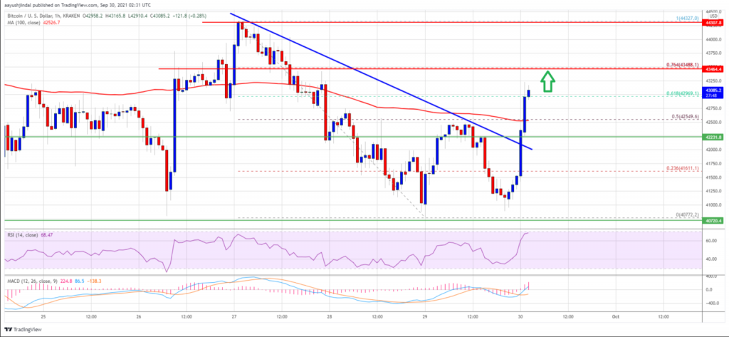 BTC, alt destek noktaları tek tek test etti. 40.000-42.500 dolar aralığında bulunan destek noktalarında tepki aldı. Şimdi ise günü 42.500 doların üzerinde geçiriyor. 100 saatlik basit hareketli ortalama baz alındığında 42.500 doların üzerinde işleme sahip. Saatlik veri de ise 42.200 doların üzerinde kalarak düşüş trend çizgisini geçti.