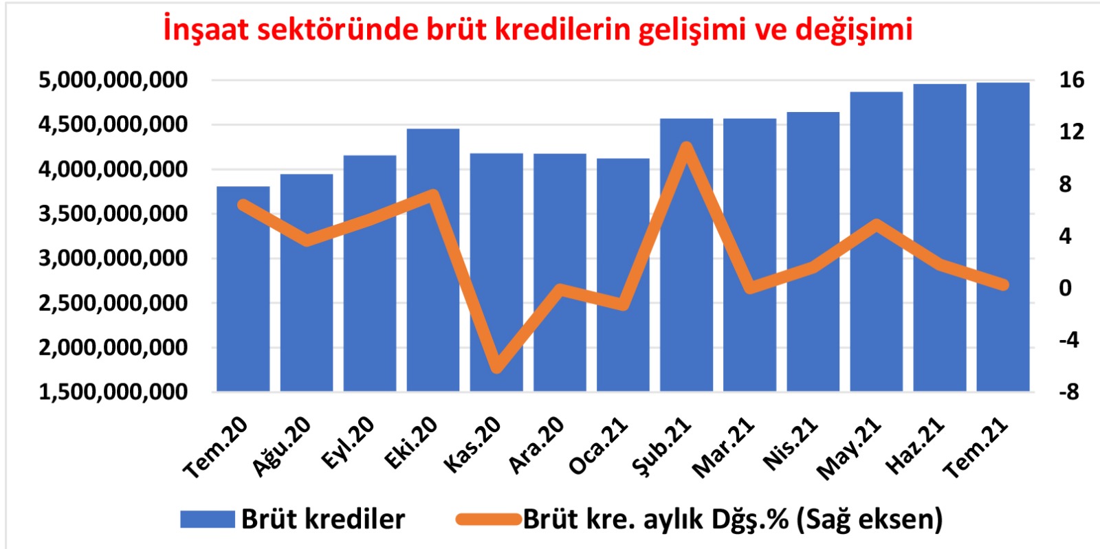 Bu miktar sektörün rekor borcu olarak kayıtlara geçti. Yılın 7’nci ayı sonunda inşaat sektörünün brüt kredi toplamı geçen yılın aynı ayına kıyasla ise %30.55 oranında arttı. Temmuz 2020’de brüt kredi toplamı 3 milyar 808 milyon TL düzeyindeydi.