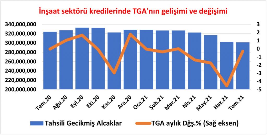 Resmi veriler, inşaat sektöründe Temmuz 2020’de 323 milyon 921 bin TL olan TGA’nın Temmuz 2021’de %6.97 azalışla 301 milyon 347 bin TL’ye gerilediğini gösteriyor.