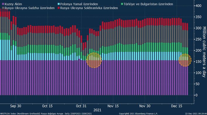 Rusya’nın Yamal üzerinden aktardığı doğal gazın miktarı en son Ekim ayı sonu ve Kasım başında bu seviyelere gerilemişti. Bu süreçte doğal gaz fiyatları megavatsaat başına 64 eurodan 76 euroya çıkmıştı.