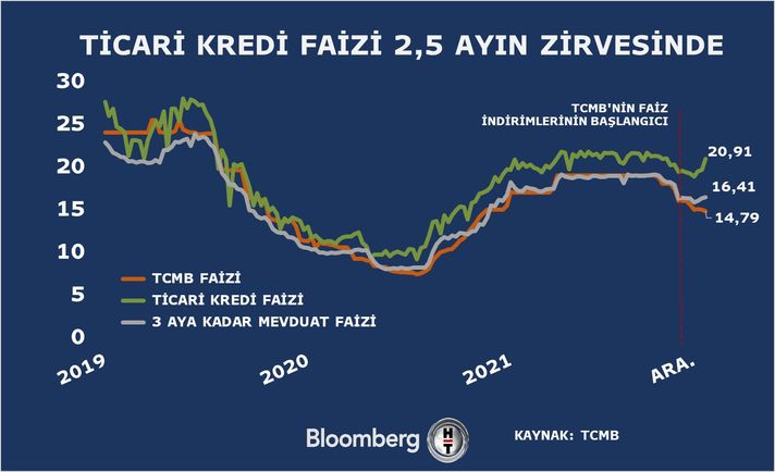 Ticari kredi faizlerinde bir önceki haftaya göre yaşanan artış da dikkat çekti. Buna göre 17 Aralık haftasında ticari kredi faizleri önceki haftaya göre 1,3 puan arttı. Bu, Mart ayından bu yana görülen en sert haftalık artış oldu.