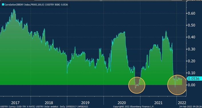 Dolar/TL ve Bloomberg Dolar Spot Endeksi arasındaki 100 günlük korelasyon 2020 sonlarında faiz artırımlarının yapıldığı dönem haricinde en düşük seviyelerde seyrediyor.