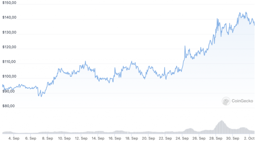 Fiyatı ay başlarında 90 dolar seviyesinde olan Quant’ın ay boyunca gösterdiği aylık büyüme performansı yüzde 43,4 oldu. Güncel fiyatı 136,81 dolar olan kripto paranın piyasa hacmi 45 milyona yakın.