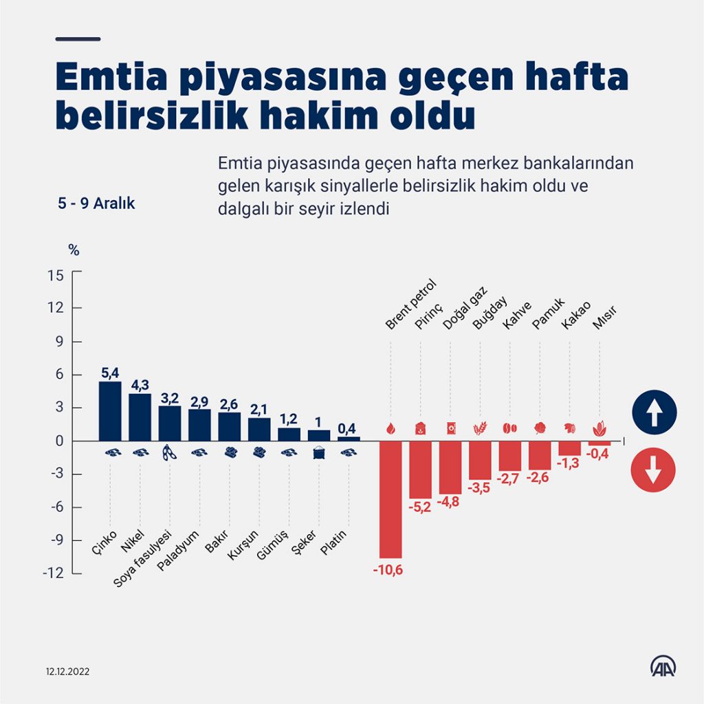 Enerji emtiasında ise negatif bir seyir izlendi. Brent petrolün varil fiyatı dünya genelinde artan resesyon endişeleri sonrası geçen hafta yüzde 10,6 değer kaybederek 76,9 dolara indi.