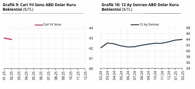 Katılımcıların yıl sonu dolar/TL kuru beklentisi, bir önceki ankette 43,03 TL iken bu ankette 42,89 TL’ye düştü. 12 ay sonrası dolar/TL tahmini ise 43,81 TL’den 43,96 TL’ye yükseldi.