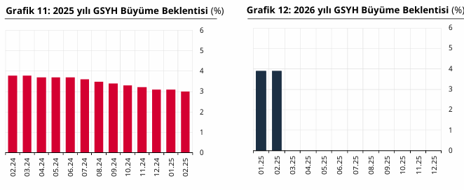 Anket sonuçlarına göre, 2025 yılı Gayri Safi Yurt İçi Hasıla (GSYH) büyüme beklentisi yüzde 3,1’den yüzde 3,0’a geriledi. 2026 yılı için büyüme tahmini ise yüzde 3,9 seviyesinde sabit kaldı.