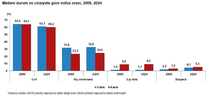Türkiye’de ikamet eden yabancı nüfus bir önceki yıla göre 89 bin 996 kişi azalarak 1 milyon 480 bin 547 oldu. Bu nüfusun yüzde 48,3’ünü erkekler, yüzde 51,7’sini ise kadınlar oluşturdu. 2023 yılında binde 1,1 olan yıllık nüfus artış hızı, 2024 yılında binde 3,4’e yükseldi.